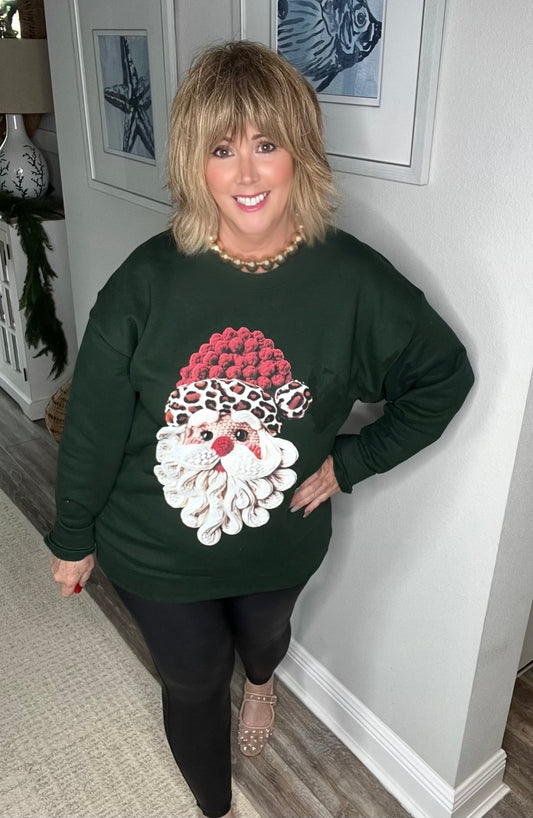 Printed Design Leopard Santa Sweatshirt-Forest Green